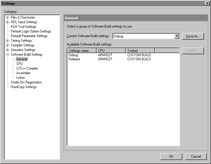 Allows you to select the software build settings you want to edit and use during a software build, create new settings, or delete existing settings.
