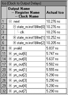 tcofromclock<clock name>throughregister<register name>is<delay value>ns+LongestClockpathfrom<clock name>tosourceregisteris<delay value>ns1:+IC(<interconnect delay>)+CELL(<cell delay>)=<cumulative delay>;Loc.=<location>; <node type>=<node name>+Microclocktooutputdelayofsourceregisteris<delay value>ns+Longestregistertopindelayis<delay value>ns1:+IC(<interconnect delay>)+CELL(<cell delay>)=<cumulative delay>;Loc.=<location>; <node type>=<node name>