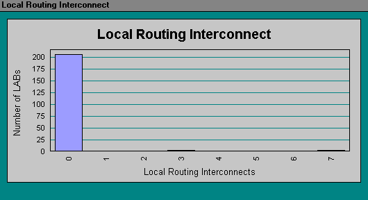 If you are using an APEX 20K, APEX II, or ARM®-based Excalibur device, the section displays a bar chart showing the number of MegaLAB structures that use a specific number of local lines (that is, local interconnect lines driven by signals that are transferred between logic elements located in the same or adjacent LAB(s)) in the local interconnect region.