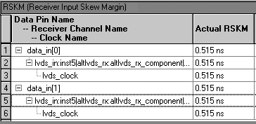 Reports the receiver input skew margin (RSKM) for the data pin, receiver channel, and clock in each LVDS circuit in the design. RSKM is the time margin available before the LVDS receiver megafunction fails to operate. RSKM is defined as the total time margin that remains after subtracting the sampling window (SW) size and the transmitter channel-to-channel skew (TCCS) from the time unit interval (TUI). The RSKM information is displayed in a resizable, multicolumn table. You can click the + icon next the data pin name to expand the table and display the receiver channel and clock names in the LVDS circuit.