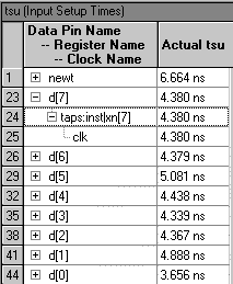 Reports the actual setup (tSU) time for the input pins that feed the clock (or latch) enable and data or clock enable inputs to the destination register. The input setup time information is displayed in a resizable, multicolumn table. You can click the + icon next to the data pin name to expand the table and list, by default, the 10 slowest data pin to register paths. You can also click the + icon next to any register name to display the clock signal that feeds the register. You can increase or decrease the number of timing requirement paths displayed in the report by specifying options in the Timing Analysis Reporting page of the Settings dialog box (Assignments menu).
