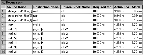 Reports the timing analysis results for any specified tCO timing requirements. The Timing Analyzer generates a tco Requirements section for all designs that include valid project-wide or individual tCO requirements. The tco Requirements section reports the timing analysis results in a resizable, multicolumn table. The tco Requirements section lists the specified tCO requirement(s), the actual tCO achieved, and the 10 worst-case slack times. A positive slack value, displayed in black, indicates the margin by which a timing requirement was achieved. A negative slack value, displayed in red, indicates the margin by which the requirement was not achieved. You can increase or decrease the number of timing requirement paths displayed in the report by specifying options in the Timing Analysis Reporting page of the Settings dialog box (Assignments menu).