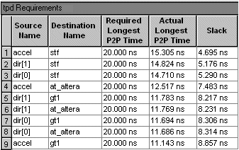 Reports the timing analysis results for any specified tPD timing requirements. The Timing Analyzer generates a tpd Requirements section for all designs that include valid project-wide or individual tPD requirements. The tpd Requirements section reports the timing analysis results in a resizable, multicolumn table. The tpd Requirements section lists the specified tPD requirement(s), the actual tPD achieved, and the 10 worst-case slack times. A positive slack value, displayed in black, indicates the margin by which a timing requirement was achieved. A negative slack value, displayed in red, indicates the margin by which the requirement was not achieved. You can increase or decrease the number of timing requirement paths displayed in the report by specifying options in the Timing Analysis Reporting page of the Settings dialog box (Assignments menu).