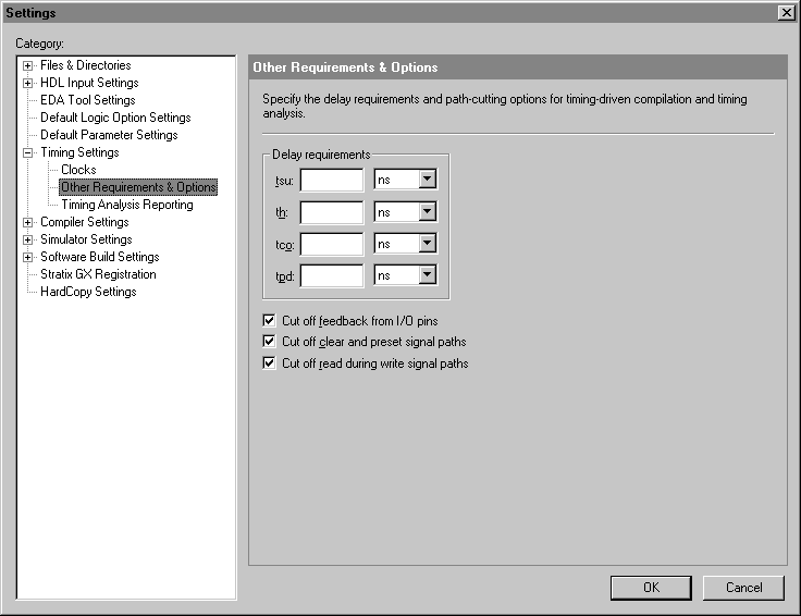 Allows you to specify project-wide delay requirements and other path-cutting options for timing-driven compilation and timing analysis.