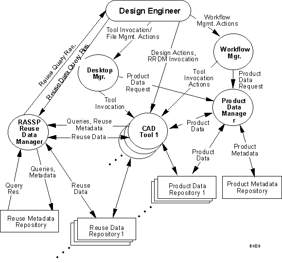 Once a CAD tool has been invoked, the designer interacts with the tool in its native environment to perform a design or analysis activity. He or she may invoke the RRDM through the CAD tool environment or directly. The RRDM may receive reusable design knowledge from the CAD tool, or meta-data only in cases where the design is managed in place. Additional meta-data is solicited from the environment as well as from the designer through the use of domain-specific templates. Both the meta-data and design knowledge (where applicable) are stored in the local design knowledge repository. The workflow manager for the RASSP Enterprise System is implemented through Intergraph Corporation's Design Methodology Manager (DMM), and the product data manager is implemented by the Intergraph Asset information Manager (AIM). Additional information on the RASSP Enterprise System is provided in Enterprise Application Note