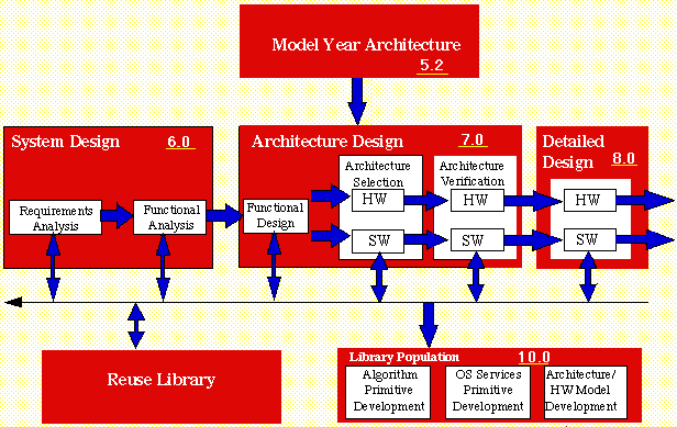 The architecture design process is broken into functional design, architecture selection, and architecture verification. During functional design, initial performance analysis is conducted based upon the processing flows and requirements flowed down from the systems design process. Processing flows are converted to detailed data-flow graphs based upon reuse library primitives. Non-DFG software requirements and tasks are identified. The architecture selection process transforms processing requirements into a candidate architecture of hardware and software elements. This process, which corresponds to the second virtual prototype iteration (VP1) of the signal processor system, initiates the trade-offs between the different processor architecture alternatives. During this process, the system-level processing requirements are allocated to hardware and/or software functions. A non-DFG software architecture is defined, if necessary, and initial software development is begun. The hardware and software functions are verified with each other via co-verification at all steps. The architecture verification process, corresponding to the next virtual prototype (VP2), results in a detailed behavioral description of the processor hardware and definition of the software required for each processor in the system. The intent is to verify all the code during this portion of the design to ensure hardware/ software interoperability early in the design process.