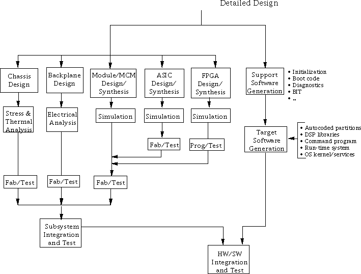 We partition and develop designs at the behavioral-level (RTL or higher) for processor-level nodes to the appropriate level for all necessary components. This includes ASIC, MCM, and board-level designs, as well as backplane/chassis designs. The process incorporates mechanical and manufacturing elements to ensure that designs meet all specifications for the particular applications. From an industry standpoint, the detailed design process is the most mature area of design, and the improvements on RASSP are optimizations to support rapid prototyping. Toward this end, the process heavily favors two areas: