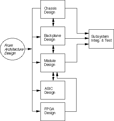 At the top level, the detailed design process for hardware is, for the most part, the same for boards, MCM, ASICs, etc. However, at the lower levels, these designs are quite different and use different tools. The hardware process is partitioned as a function of the hardware element, e.g., chassis, backplane, board, chip, etc.
