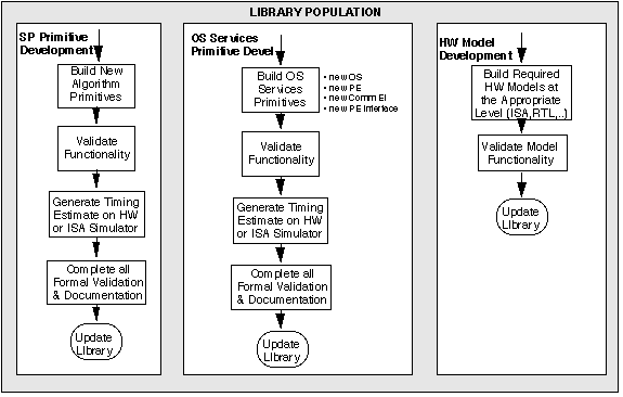 When any of the required support components are not present in the library, we cannot proceed with the design without at least defining a prototype element. We call the process of adding any component function to the library, 'library population'. When the first RASSP example is designed there will exist, by design, a sufficient set of primitives and components in the library to support the example. However, this set must be extended over time to accommodate new technology and applications. The methodology supports the ability to add or modify components of this library. Successful application of the RASSP concept depends upon the ability to perform the library population rapidly and economically so that the project development timelines and cost are not adversely affected. It is important to note that a complete library component is not needed for all the design phases. The methodology allows the design process to proceed in stages, along with the library population effort, to complete the library description. We accomplish this by permitting prototyping of primitives for inclusion in the library as a prototype element. The prototype element may then be used in the hardware/software codesign process to perform high-level architecture trade-off studies during architecture selection. In reality, we can early (based upon the algorithmic processing flows developed during the system design process) that we require new primitives for the application. In fact, application-primitives may be prototyped during system design to simulate the functionality of the required processing. After being confirmed as a desirable primitive, we must validate the prototype element for permanent inclusion in the reuse library. We can perform this validation process in tandem with other portions of the development.
