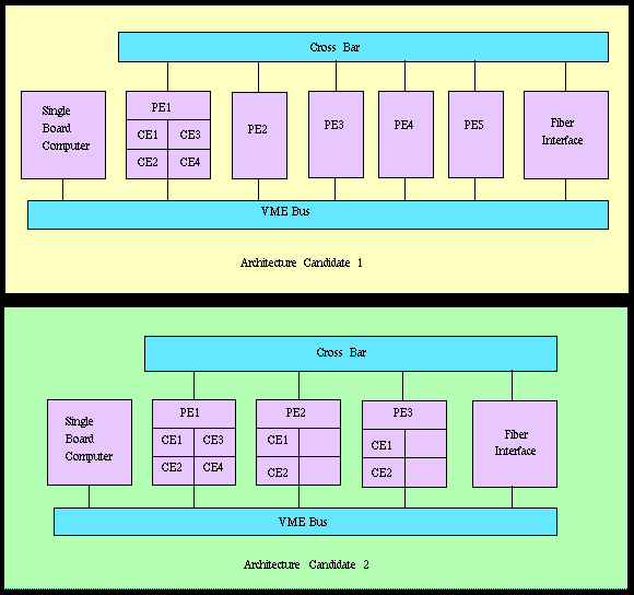 The ATL RASSP team selected a Synthetic Aperture Radar Digital Signal Processor (SAR-DSP) for a trade-off between two different architecture candidates. A preliminary functional analysis was performed to identify the hardware and software needed by each candidate architecture to satisfy the SAR functional requirements. The Candidate 1 architecture uses a mature technology. As shown in Figure 1-5, this architecture consists of a single-board computer (used as a controller), five processor elements (PE1-5), a cross bar, a fiber interface, and a VME Bus. Each processor element contains four separate computational elements (CE1-4). Also shown in Figure 1-5 is the Candidate 2 architecture. This is similar to the first, except that it uses three state-of-the-art processor elements. In addition, PE2 and PE3 contain only two compute elements rather than four.
